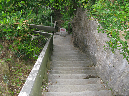 摩文仁山上から北側斜面を下っていく木造の階段ですが、破損がひどく立ち入り禁止になってました。