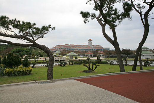 「島守の塔」前から「沖縄県平和祈念資料館」を見通しています。