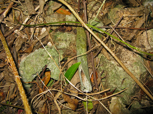 上に被さっていた岩を除けた後の様子です。直接雨が当たる部分と岩陰とでは、これだけ色合いが違うというのが見てとれます。
