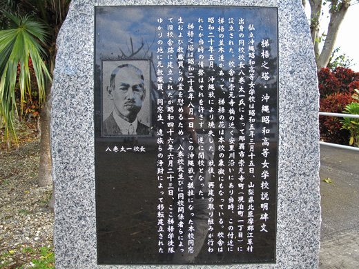 最初は那覇市内崇元寺の校庭跡に、昭和25年8月元校長八巻太一氏及び父兄や同窓生によって建立され校歌にちなんで「梯梧之塔」と命名されたのです。