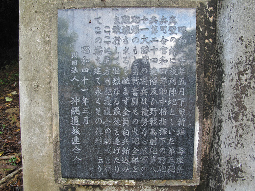「昭和20年5月下旬新垣・与座岳・真壁の線に放列陣地を敷いた第五砲兵団司令官和田孝助中将指揮下の野砲兵第24連隊及び野戦高射砲第81大隊の将兵は優勢なる米軍の砲爆のもと勇戦奮闘その火砲を全部破壊されるも怯まず全員白兵斬り込みを敢行して壮烈なる最期を遂げたり。 ここに南方同胞援護会の助成を得てこの塔を建て永くその偉烈を伝う」