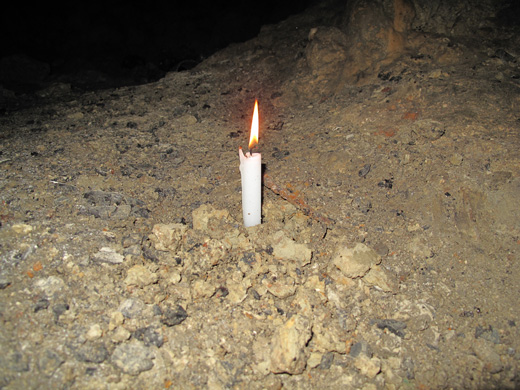 酸欠等の事故を防ぐために、50メートルほど進む度に、ロウソクに火を付け酸素の有無を確認しました。風は通っていないのか炎もあまり揺れません。帰る時にはこのロウソクを回収して出口に向かいます。