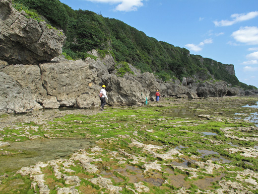 引き潮時の様子です。これぐらい岩礁が露出していると歩きやすいですね。ジャングル内の水平移動は大変ですが、これならば超簡単に移動できますよ。