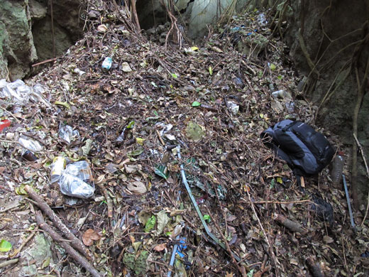 見上げてみると、上にも引っかかったごみがたくさん見えますね。この摩文仁V字谷は各県の慰霊塔の背後に位置しますので、おそらく慰霊祭で出たゴミをこの谷に安易に捨てたものと思われますね。