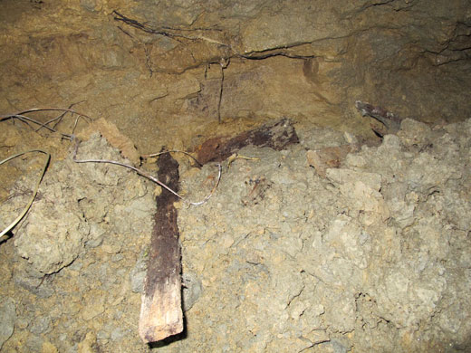 構築壕ですから、壁際にはご覧のように落盤防止用の木材もかなりの数見る事が出来ました。