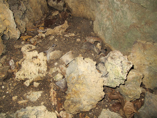 子どもの頃粘土遊びをして、造形したものを幾日も放っておいたら粘土が硬くなって再び使えなくなった…。という経験をした方も多いと思われますが、この壕内の天井の岩盤を除く壁面は一見すると岩に見えますが、そんな「硬くなってもろくなった粘土」という表現が一番ピッタリするのではないかと思われるくらいもろい印象を受けます。ですから容易に壕内を掘り進めたと思えますが、米軍の攻撃を受け激しい衝撃で、容易に壕内は落盤したのではないかと推測されます。