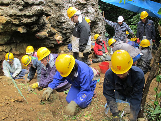 5班、地元沖縄の人達が大きな岩陰で収骨作業をしていました。