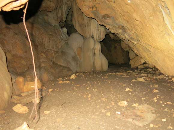 もう少し前進しますと、ご覧のように見事に天井の固い岩盤と、その下の比較的柔らかい粘土層に分かれているのがよく確認できます。天井部分は掘るのに多大な労力を要しますが、壁・床面の粘土層は容易に掘ることが出来たのではないかと推測されます。この場所に来てから先は、この写真の様に掘り進められた壕空間が、碁盤の目のように縦横に走っていました。驚きました。気をつけないと迷子になってしまうほど市街地のように通路が走っています。写真では構築されたその壕の複雑さを写し止められないのが残念でなりません。