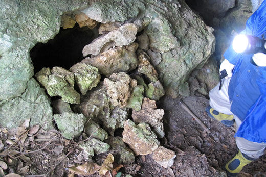 破壊された遺骨安置室入口。この写真は昨年の2月12日に撮影したものです。ご覧のように一面に塗られていたセメントが破壊され、内部の収骨作業を追えたあと、ご覧のように岩を積み上げたものと思われます。積み上げた岩の苔の生え具合から見て、夏を越していないと思えます。つまり今年の冬の間に盗掘されたとみて間違いないでしょう。
