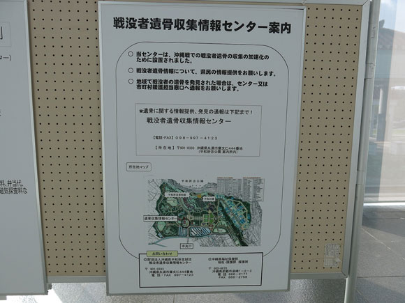 平和祈念公園内にある戦没者遺骨収集情報センターの中野さんを訪ねたところ、「平和祈念資料館で『平成24年度戦没者遺骨収集活動写真パネル展』をやっているから見てきたら」と勧められたので見学して参りました。