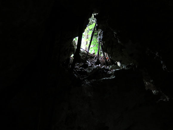 ここが壕の底のようです。底部といっても広い空間は無く、ご覧のように岩の割れ目程度の空間です。上を見上げても空などは見えないので、相応に安全な壕であったと思われます。
