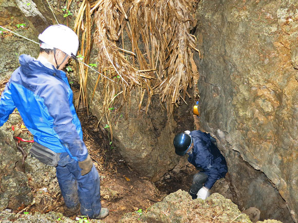 松永さんと私はこの地を1月に訪れましたが、吉田さんと福岡さんは初めてなので、まず守備軍構築壕を見てもらいました。写真奥に写されているのが、すでに収骨が済んでいると思われる構築壕です。