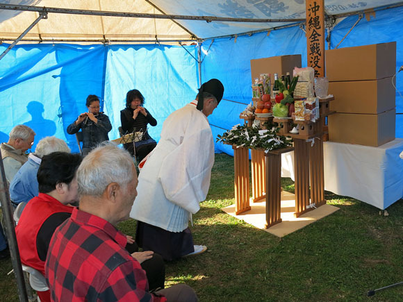 4時になりましたので、参加者全員がテント内や周囲に集まり、龍笛と篳篥とによる中正楽が奏でられる中、祭主である金光教那覇教会の林先生の主導で第40回沖縄戦戦没者現地慰霊祭が始められました。
