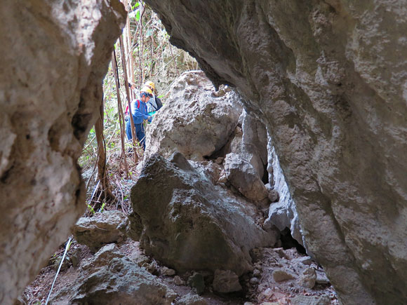 作業収量近くになり出口を探している時に、昨年沖縄班の皆さんがご遺骨を発見した場所がこの近くにあることが解ると、林先生が慰霊したいと言う事になり、皆でその発見場所に向かいました。もう少しで発見場所に到達する段階です。