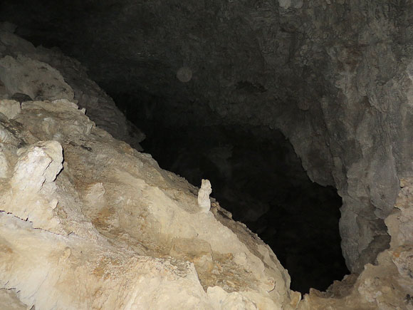 右上ライトで照らされている部分が、鍾乳石のツララ部分に針金でランプなどを吊したとされる場所です。