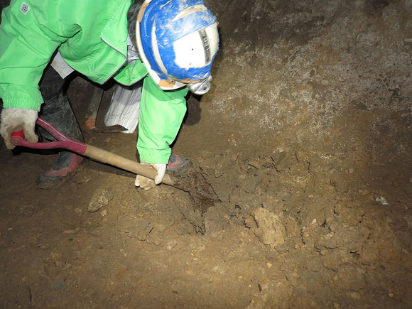スコップを入れてみて初めて解るのですが、土から昨日よりも大幅に水分を含んでいるようです。ヌヌマチガマ入り口は、奥に進むほど下り勾配ですから、大きなヌヌマチガマ開口部に降った雨は確実にガマ入り口から壕内部へと浸透してくると言う事ですね。