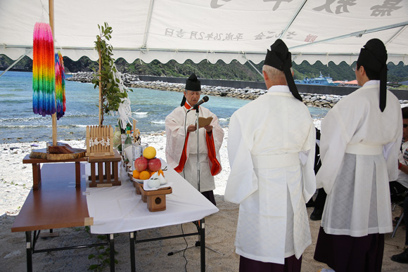 あの沖縄戦が終わりまして六十九年、今年三月五日、慶良間諸島は国立公園に指定されました。ここで改めて、汝達のことが思われ、畏れながら、この海域に鎮まれたままの汝達の御霊をお慰め申し上げたく思い、ささやかながら、御前に御饌御神酒をはじめみ恵みのものお供え致し、思いを同じくする者御前に集い、沖縄海域戦没者・特別攻撃隊員慰霊祭併せて沖縄海域平安祈願祭お仕え申し上げます状をなにとぞ御心も安らかに清やかに御聞き届け御受け取りくださいませ。