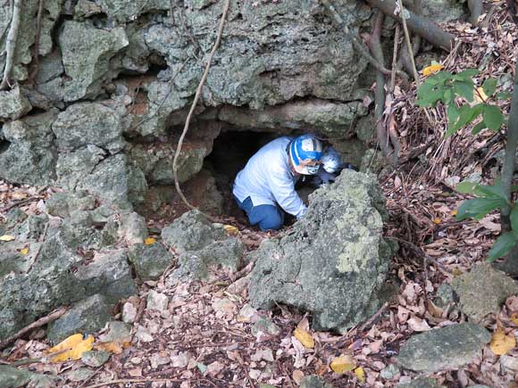 ここがお墓のすぐ横にある壕入り口です。この壕は最近国吉さんが調査・収集をされたという事を、松永さんが地元情報で聞きつけ、それで一度この壕に入って見たいと思われたそうです。中がどうなっているのか、さっそく一緒に入って見ましょう。