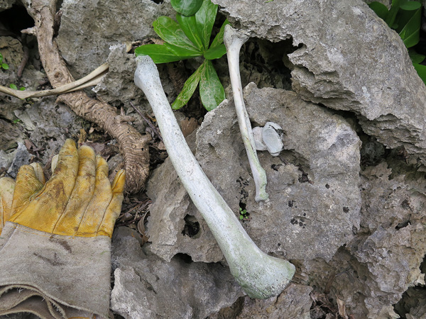 周囲を探したところ、右側に岩の割れ目があり、中を懐中電灯で照らすと御遺骨がありました。大腿骨です。例の丸い大腿骨頭がありますので、これは人間だけにある特徴ですから、この御遺骨は人間である事が確定しました。また写真では解りにくいですが、窪みの中には、他にも幾つかの御遺骨がありまして、骨盤もハッキリと認識できました。