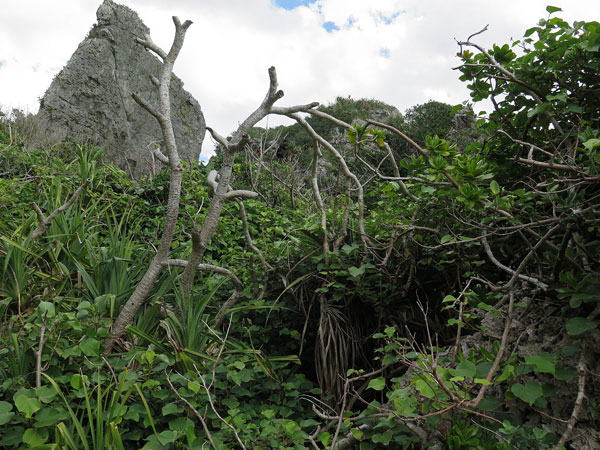それにしてもこんな岩山なのに、栄養たっぷりなのかどでかいアダンとその他の植物の壁が凄いです。写真右寄りの岩の切れ目を目指す以外に手は無いようです~。それにしても晴れで良かった。雨や曇りなら、終日懐中電灯が必要になるような暗いジャングルになったはずです。
