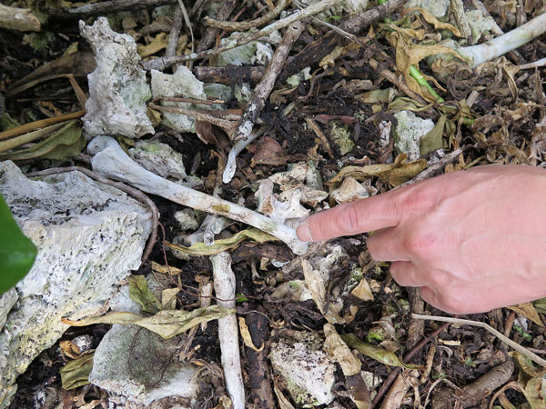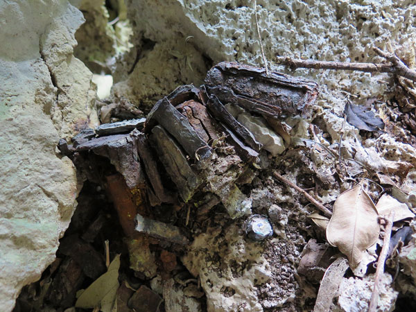 な~んだ、発見された脛骨からわずか1.5メートルの所に、腰から上の御遺骨が大量にある事が判明しました。枝葉や枯れ草そして小岩等でカモフラージュされていて気づきませんでしたが、ご覧下さいませ。よく見ると沢山の御遺骨がそのまま見えます。