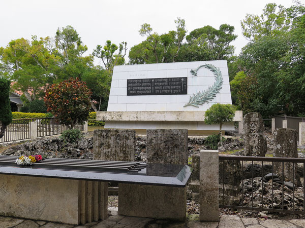 新緑鮮やかな生け垣の先に「ひめゆりの塔」が見えます。午前8時過ぎ、まだ早朝である事から観光客は私以外まだ誰も居ませんでした。