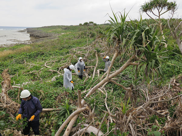 アダンが繁茂しているという事は、この一帯は基本的に土が少ない岩場という事になります。沖縄戦当時、このアダンは皆無だったと想像しながら、所々わずかに盛り上がる、人が隠れられそうな岩場を求めて調査は続きます。