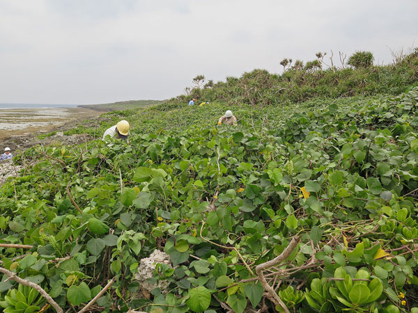 植物が繁茂する平坦な草原に見えますが、実際の地際はゴツゴツとした岩場で、人一人が隠れるぐらいの岩陰は無数にあります。そうした場所を丁寧に調査・確認して進みます。こうした海岸線に身を隠した人の証言では、隠れる岩場が無い場合は砂地を探し、少し掘って自分自身を埋める。つまり口と鼻のみ地表に出すだけで、最終的には全身を砂に埋める事で、米軍掃討兵士の目をはぐらかしたと言います。