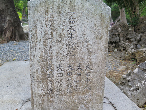 「赤心之塔」の裏側です。戦死された大田家の五人の名前が刻み込まれています。