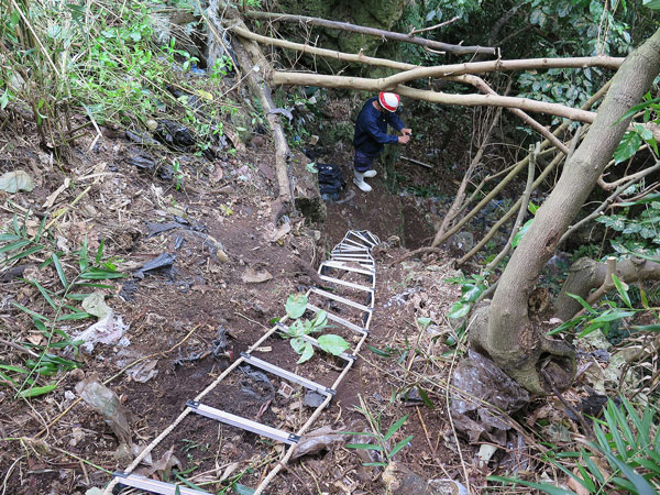 ここは西側ルートの崖下部分では唯一の滑落の危険がある難所なのですが、ついに問題を解決し難所ではなく、ただの通りにくい場所になりました。安全ロープ使用により、岩場の何処を通るのかという誘導もほぼ万全です。ご覧下さい。昨夜那覇市のホームセンターで購入したものですが、アルミ製の脚立を置く事により、一気に問題点を解決しました。滑落の危険性もゼロになりました。頭は使うためにあるというのを実感しました。