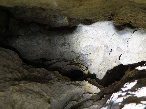 松永さんと二人で、下の穴に向けて「南埜さん居ますか」と叫んだら、下から「居ますよ」と返事が返ってきました。南埜さんはすでに下の壕で作業を開始しているようです。私が下の壕を見てくることにしました。写真の割れ目から入っていきます。