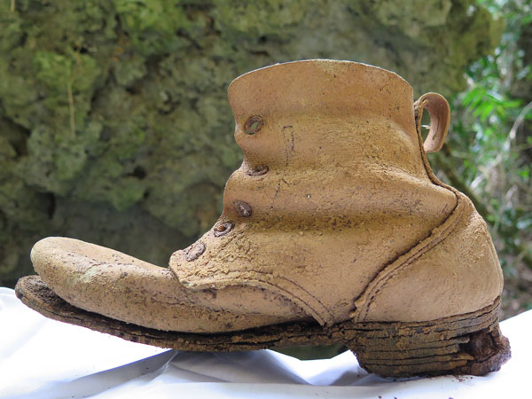 これが出てきた編上靴(兵隊靴)です。すでに紐は消失していますが、皮の部分はかなりしっかりした状態を保持しています。これは恐らく雨に当たらない場所にあった事と、比較的湿気の少ない壕内にあったからではないでしょうか。