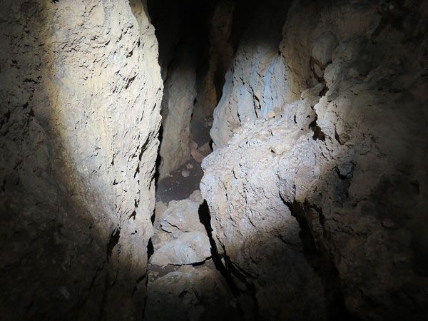 ここで壁に突き当たりました。行き止まりのようですから引き返しましょう。それにしても深い壕です。岩の割れ目にある空間と言ってよいでしょうが、奥行き40メートル近くあるのではないでしょうか。