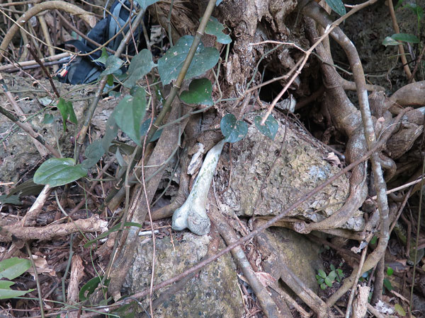 近くに居た田中さんや、福岡さんに、御遺骨を発見したので、この周囲を注意深く見て下さいと御願いしたら、早速福岡さんが「足の大きな遺骨がある」と叫びました。それがこの写真です。下肢の大きな遺骨が完全に露出してありました。