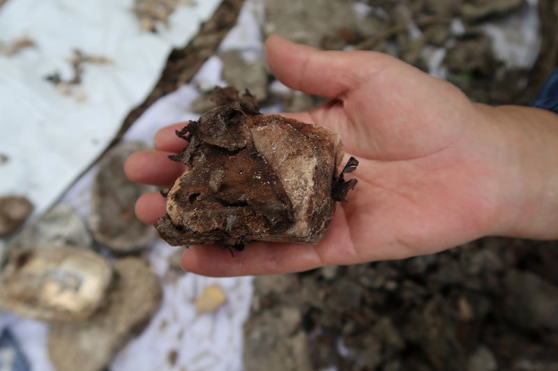 これは何でしょうかね。革製品の可能性が高いですが…。個人が持参した物品の可能性が高いですから、遺骨収集情報センターに持ち込む遺品の中に入れておきます。