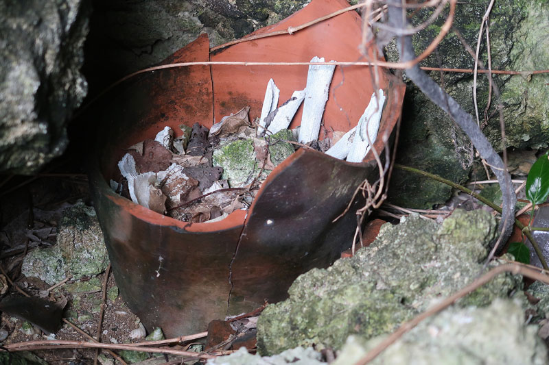 瓶に入った風葬骨です。この場所は台風など風混じりの雨が直接降りかかる場所であると思われますので、風で飛ばされたり雨で流されるのか、粉っぽい骨は見当たりませんね。道路脇にこうした風葬骨が野晒しにされたまま存在するというのは、所有者不明となったのでしょうかね。もしそうであったにしても、少なくとも私が見てきた限り30年以上も手が加えられた形跡を見ていません。古来沖縄人の遺骨が納められた墓なのですから、石垣だけでもキチンと積み上げて古墓として管理保存してほしいですね。