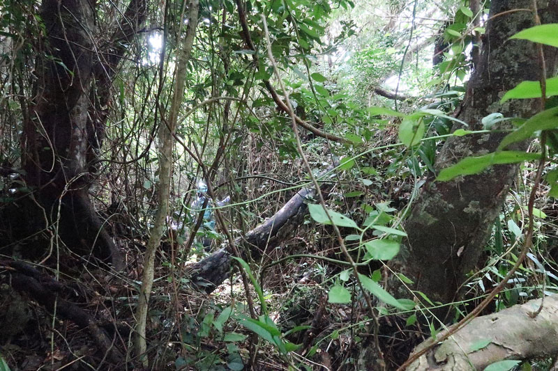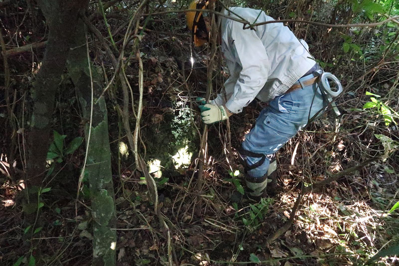 吉井さんです。早くもご遺骨がありそうな場所の蔓や落ち葉などを移動しています。腰ベルトには金属探知機がありますね。