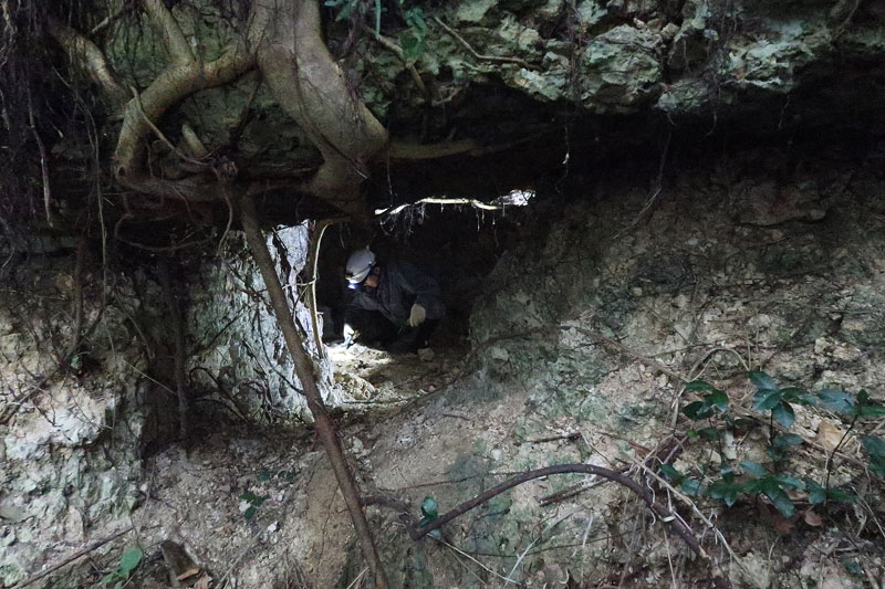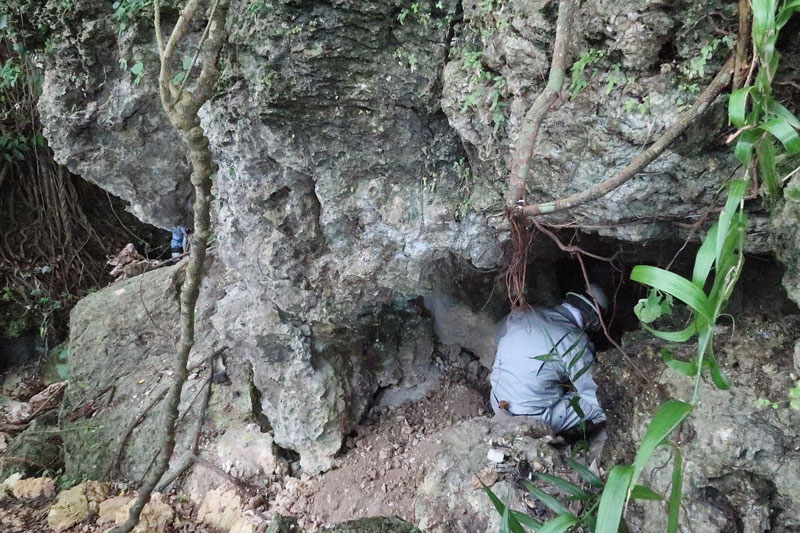 私の目の前に人が一人入れるぐらいの穴がありました。掘ったものではなく、自然の岩の隙間という印象ですが、蛸壺のような深さがあります。向きも北側を向いており、北側から攻めてくる米軍に有効です。早速掘ってみましょう。