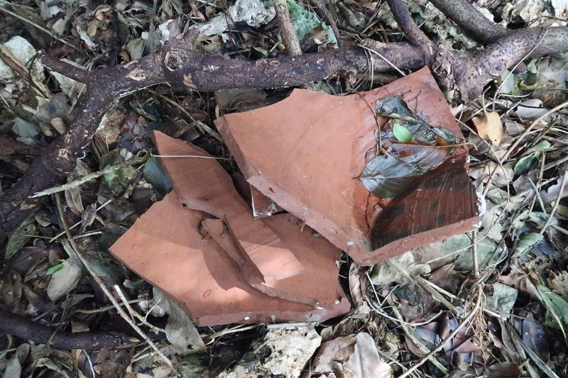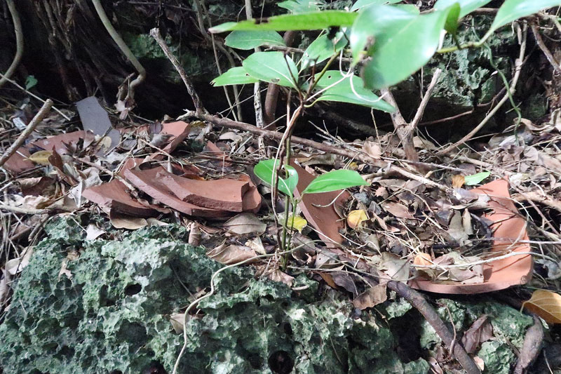 割れた水瓶と割れたお茶碗が見えますね。誰かがここに集めたのか、元々ここにあったのか、それは不明です。