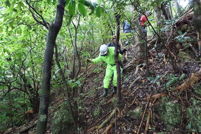 全員無事に壕から出ました。ロープは拝所の管理者が張ったようです。このロープに沿って降りていきます。