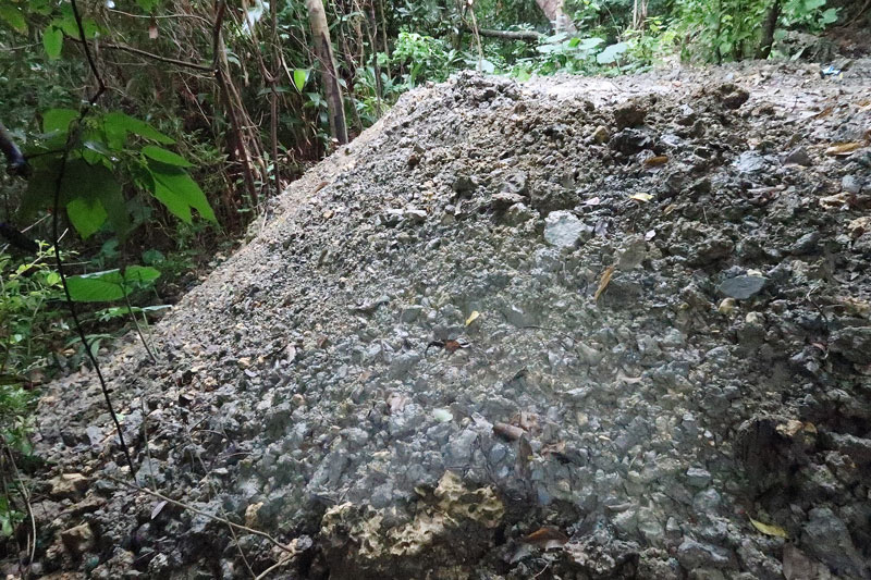 壕口に戻る途中ご覧のような風景が目の前に現れました。「何だろう」と思い近づいて見ると、南埜さんが壕内から運び出した粘土質の土砂でした。