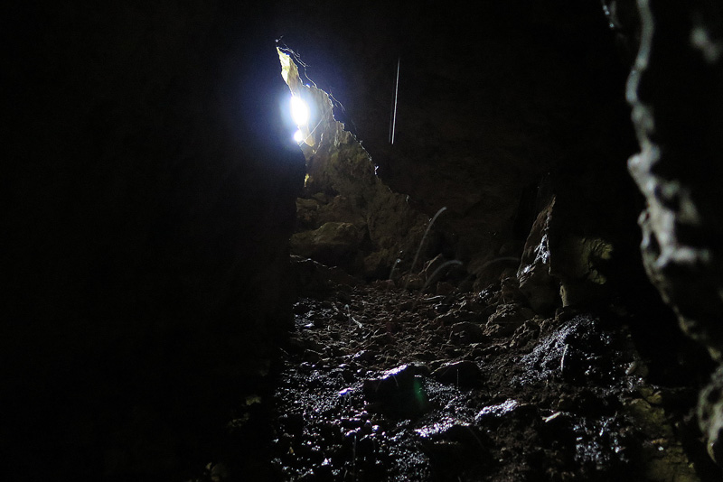 3メートル程超狭い部分を通過すると、広い空間に出るのですが、いきなり断崖のような場所に出てしまうのです。松永さんと一緒に入った際も感じた事ですが、手と足の連係が上手くいかず手足がもつれると、3メートルぐらいあるであろう壕底に転落‥。という事態になりかねません。