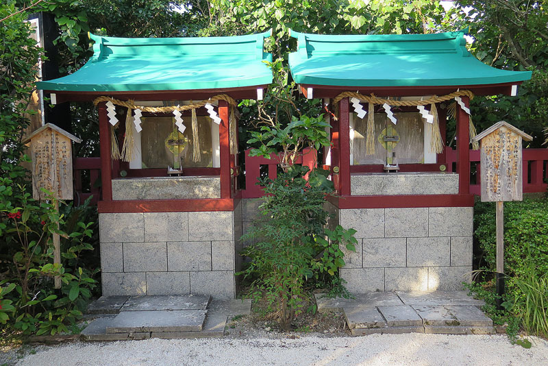 波上宮本殿の左側に二つの小さな社があります。「世持神社(旧郷社)仮宮」「浮島神社(旧県社)仮宮」と書かれています。左側の世持神社とは昭和12年(1937年)に創建され、社名の「世持」は「豊かなる御世、平和なる御世を支え持つ」を意味する沖縄古語であるとの事です。奥武山公園にあった世持神社は沖縄戦で社は燃えましたが、戦火を逃れたご神体は戦後沖縄総鎮守の波上宮に預けられました。戦後那覇市は奥武山公園内に社を再建することを決めており、社殿は奥武山、神体は波上宮にあるという状態になっているようです。