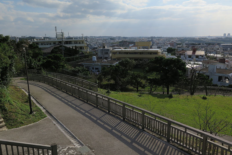 展望台を降りて直近の遊歩道から、新都心のおもろまちや首里城方面を撮影しました。右端にツインタワーとして知られるマンションのリュークスタワー東西棟が見えます。その位置がおもろまちという新都心がある場所です。ツインタワーの直ぐ左横には、沖縄決戦のクライマックスと言える程の激戦が展開された安里52高地、米軍はシュガーローフヒルと呼ぶ場所があります。そして写真左側奥には首里城も写されています。注目すべきは、ここから首里高地にある守備軍司令部まで、もう遮る物は無く目視で見通す事が可能となってしまう点にあります。距離的には撮影地点から、シュガーローフヒルのあるおもろまちまで約4.5km、守備軍司令部のある首里城まで約3.7kmといった距離です。こうした事から、繰り返しますが前田・仲間高地両高地を含む第二次防衛ライン維持・確保こそが沖縄決戦の天王山となる‥。のがご理解頂けると思います。
