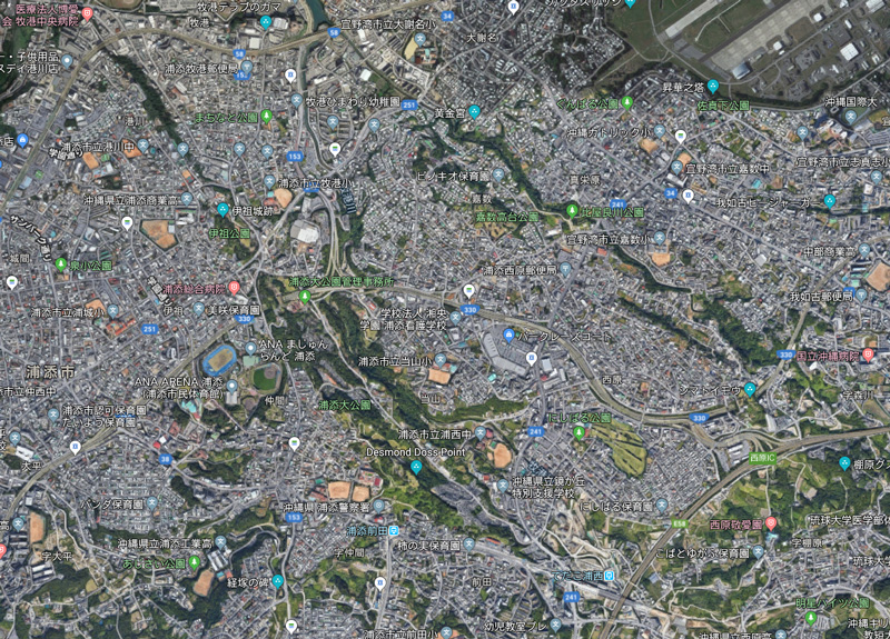 図上の文字がギリギリ読めますかね。写真中央部に浦添大公園、そしてその少し右側に嘉数高台公園が位置しています。写真右上側の黒っぽく見える部分は普天間飛行場です。前田高地・嘉数高地共に北側斜面は崖になっている事に注目して頂きたく掲載しました。両公園は緑豊かな樹林帯となっていますが、特に細く長い樹林帯は、恐らく宅地開発等に不向きな崖とか急斜面の土地とみて間違いないでしょう。その細長い樹林帯を追うと西側は仲間、伊祖公園そして牧港方面に連なり、一方東は幸地、西原、我謝そして中城湾方面に連なっています。