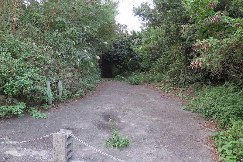 独立高射砲27大隊本部壕に行くには、まずは糸満市大度の国道331号線沿いにある「海の見えるレストラン」を目標にし、同レストランの崖下側に小さな道がありますので、その小道を見つけたらしめたものです。国道331号線からご覧の脇道に入ります。路面は舗装されていますから歩きやすいです。またこの通路は門中墓の参道となっていますので、墓前を通らせて頂いて独立高射砲27大隊本部壕に向かいます。