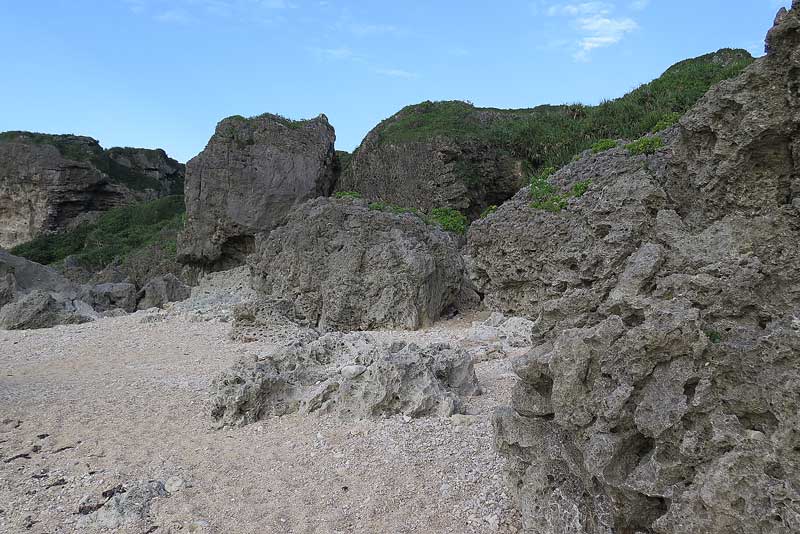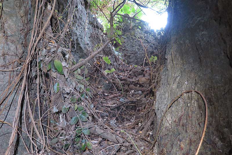 階段を30メートルほど下ると左に曲がり、ご覧のように今度は水平移動になります。おやっ道が出来ていますね。直近で誰か入られたようです。因みにこの冬の時期はハブはいませんから、その点だけはご安心下さい。ただこうして毎年慰霊巡拝を続けていますと、目の前に広がる風景が、“人間の関与” が失われ草の丈が伸び、木があちこち増えてやがて樹林となるという変遷の姿を垣間見ると、ちょっと寂しいものがありますね。(T_T)