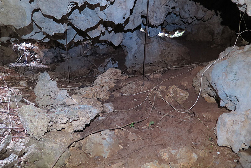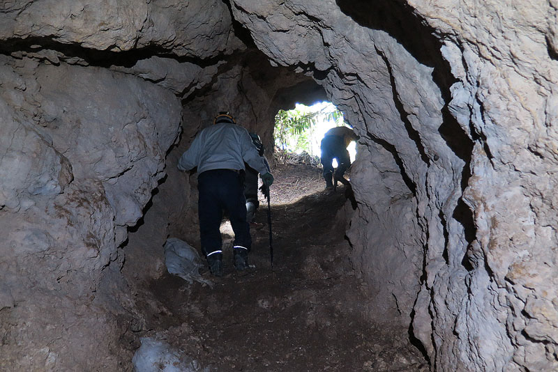 壕口上部はコンクリート製です。丸太を転がし型枠代わりに使ったと思われます。勾配がかなりあるのが見て取れます。コンクリート部分をよく見て下さい、戦後70余年を経ていますが、既に10センチほど成長した鍾乳石が垂れ下がっていますね。