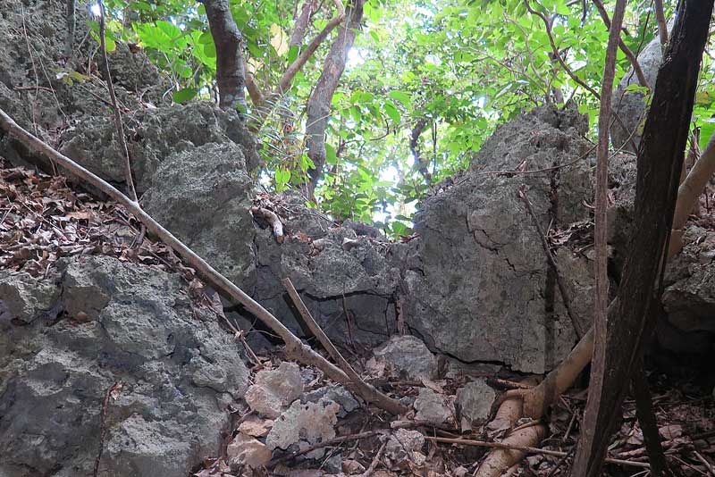 ここが独立高射砲27大隊本部壕の壕口です。壕入り口に大きな岩が鎮座していますが、この巨岩は平成25年(2013年)の慰霊巡拝で初めて見ました。その二年前に来たときには無かったので、平成22年(2010年)にあった沖縄での大きな地震は、関係ないように思います。