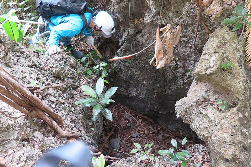 壕口が見えてきました。昔と比べ結構発見しにくくなっています。昔はこんな事は無かったのですが、遺族会等の活動が収束に向かいつつあるという事でやむを得ない事態ですね。手前に木が切られているのが見えます。やはり誰か直近で訪れましたね。